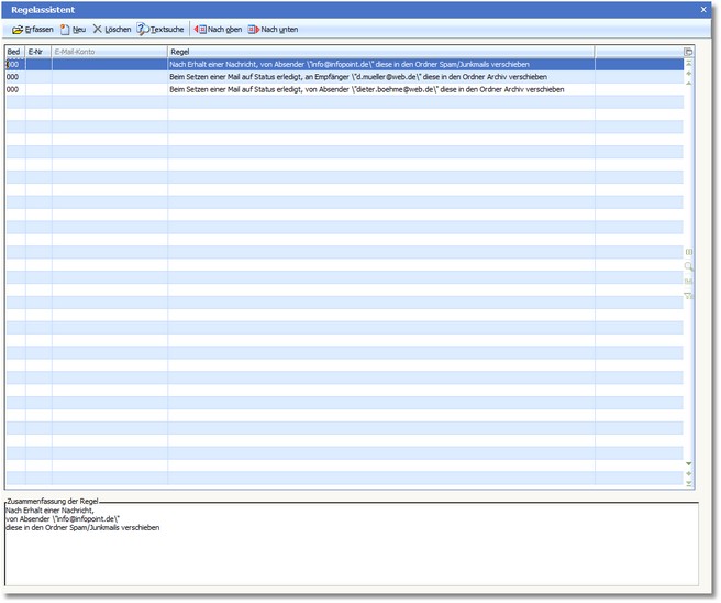 Der Regelassistent hilft Ihnen beim automatischen Ablegen eingehender/ausgehender Nachrichten. Sie können beispielsweise Nachrichten mit einem bestimmten Betreff durch eine Regel in einen bestimmten Ordner verschieben lassen und sich beim Eintreffen von Nachrichten bestimmter Personen informieren lassen.