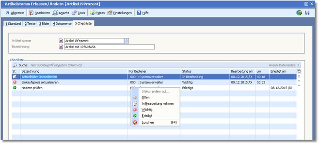 In der Karteikarte "Checkliste" können dem Artikel nun ToDo´s hinzugefügt, bearbeitet, als erledigt markiert, oder auch gelöscht werden.