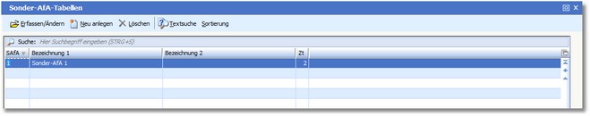 Das Programm öffnet zuerst eine vorgelagerte Auswahl, in der die bereits erfassten Sonder-AfA-Arten tabellarisch angezeigt werden. In dieser vorgelagerten Auswahltabelle sind alle bereits beschriebenen Such- und Sortierfunktionen aktiv.