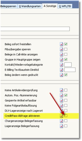 Um die Bonitätsprüfung für eine Beleggruppe zu ermöglichen, aktivieren Sie den Status des Feldes „creditPass-Abfrage aktivieren“. Sollte das Feld nicht auf der Maske vorhanden sein, können Sie es einbinden (DBK30_2004_1).