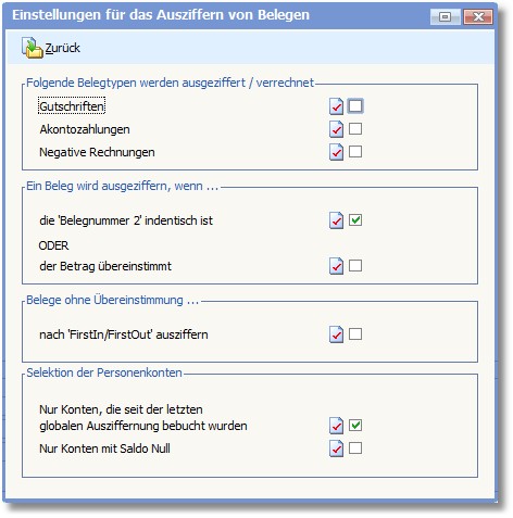 << Hier KLicken um eine Inhaltsübersicht anzuzeigen >> Navigation: Finanzbuchhaltung > Laufende Vorgänge > OP-Verwaltung > Funktionen vorheriger Versionen > Globale OP-Bearbeitung > Einstellungen für das Ausziffern von Belegen |