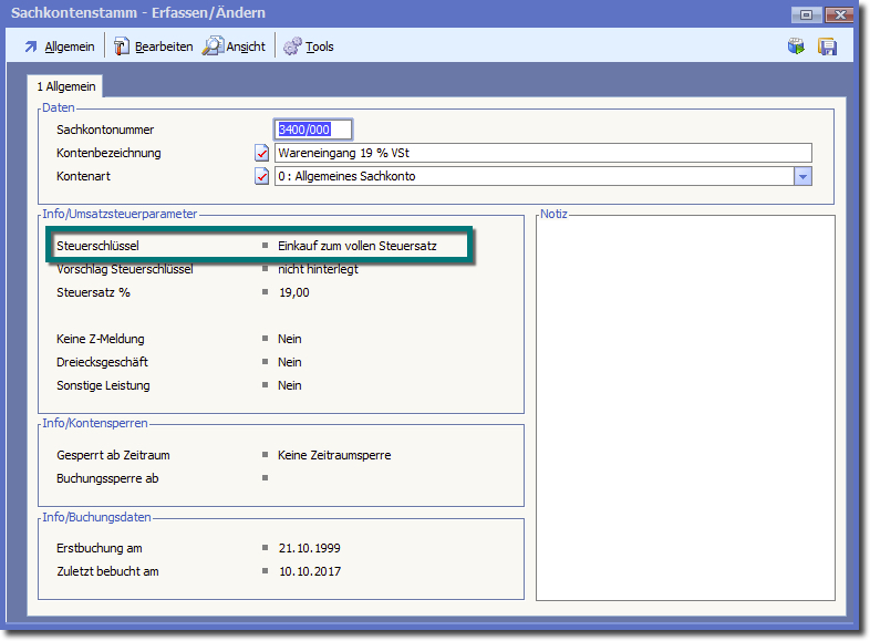 2.Sollte die Einstellung im Konto nicht sinnvoll sein (wenn beispielsweise unterschiedliche Steuersätze möglich sein sollen), ist in den Stammdaten des Kontos der Steuerschlüssel zu korrigieren.