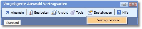 << Hier KLicken um eine Inhaltsübersicht anzuzeigen >> Navigation: Warenwirtschaft > Stammdaten > Basisdaten > Vertragsarten > Einstellungen - Vertragsdefinition |