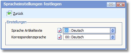 Dieses Kennzeichen steuert die Sprachausgabe der Artikeltexte innerhalb der Belegerfassung und der gedruckten Korrespondenz. Eingetragen wird der 2-stellige Sprachschlüssel der gewünschten Sprache, in der die Artikelkurz- und Langtexte erscheinen sollen.